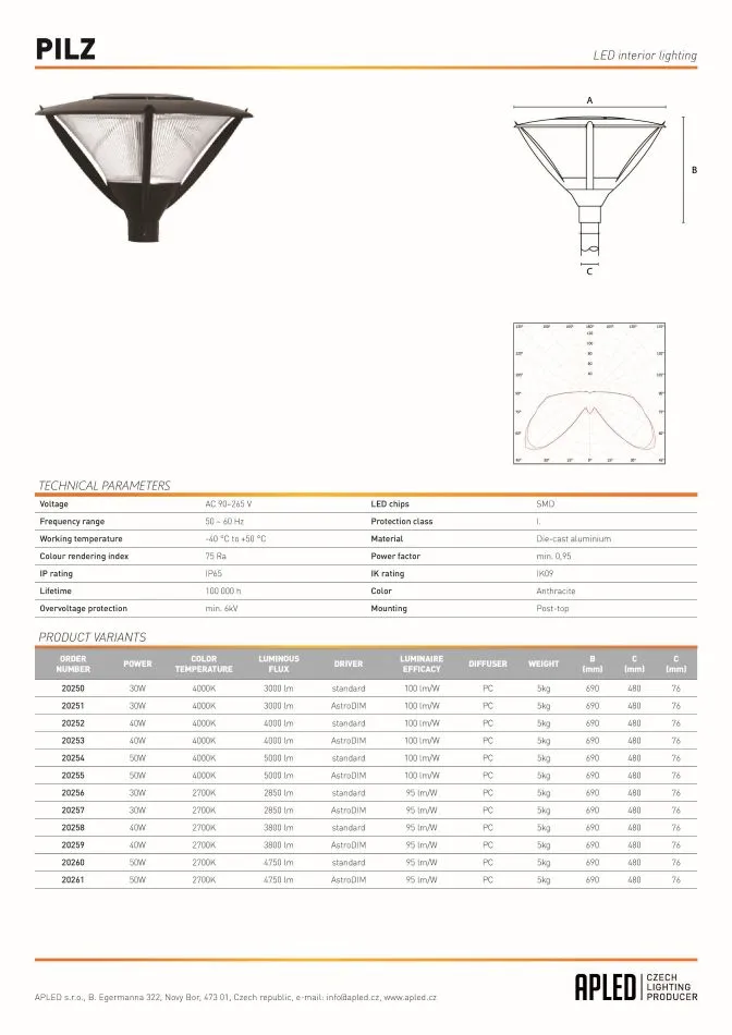 Tutvustame APLED-i PILZ tänavavalgustit – täiuslik kombinatsioon vastupidavusest, tõhususest ja klassikalisest disainist. PILZ on loodud täpseks linnavalgustuseks, pakkudes võimsust vahemikus 30 W kuni 50 W ja valgusvoogu 2850–5000 luumenit, tagades ereda ja ühtlase valgustuse igas väliskeskkonnas.