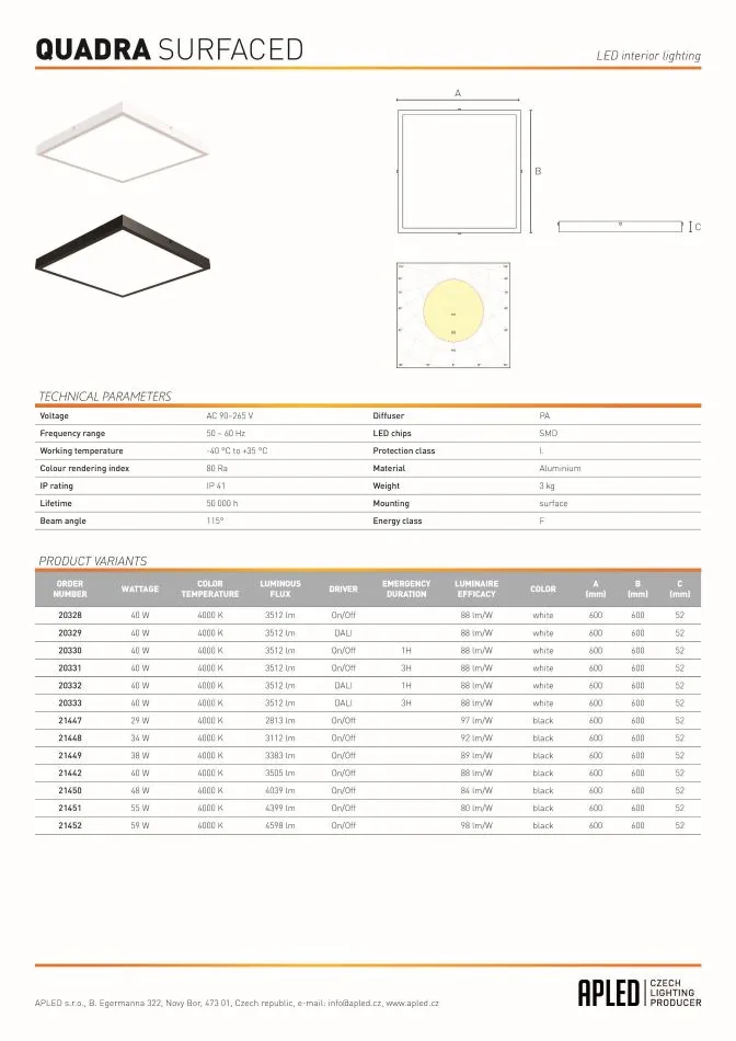 Kaikki QUADRA-valaisimet valmistetaan Euroopan unionissa valmistajan APLED toimesta, mikä takaa korkean laadun, toimintavarmuuden ja EU-standardien mukaisuuden.