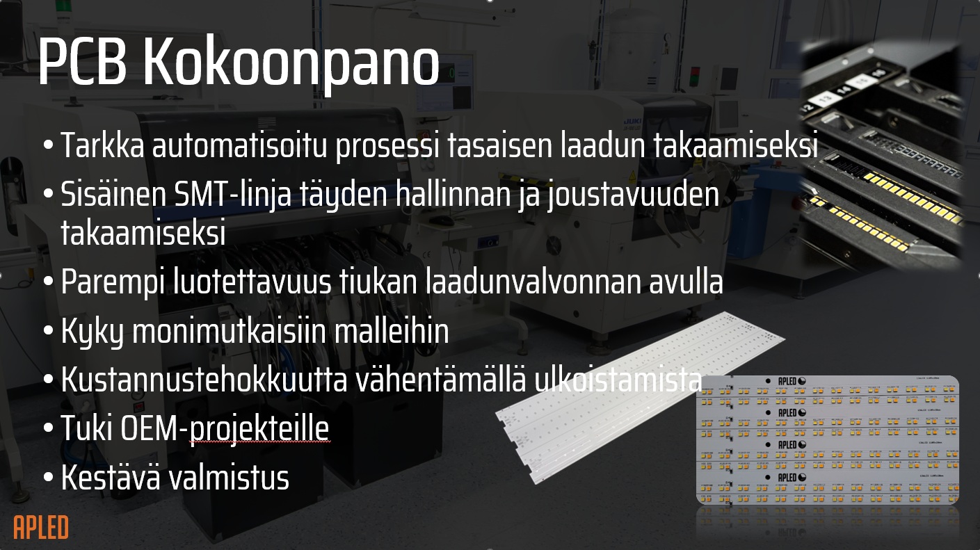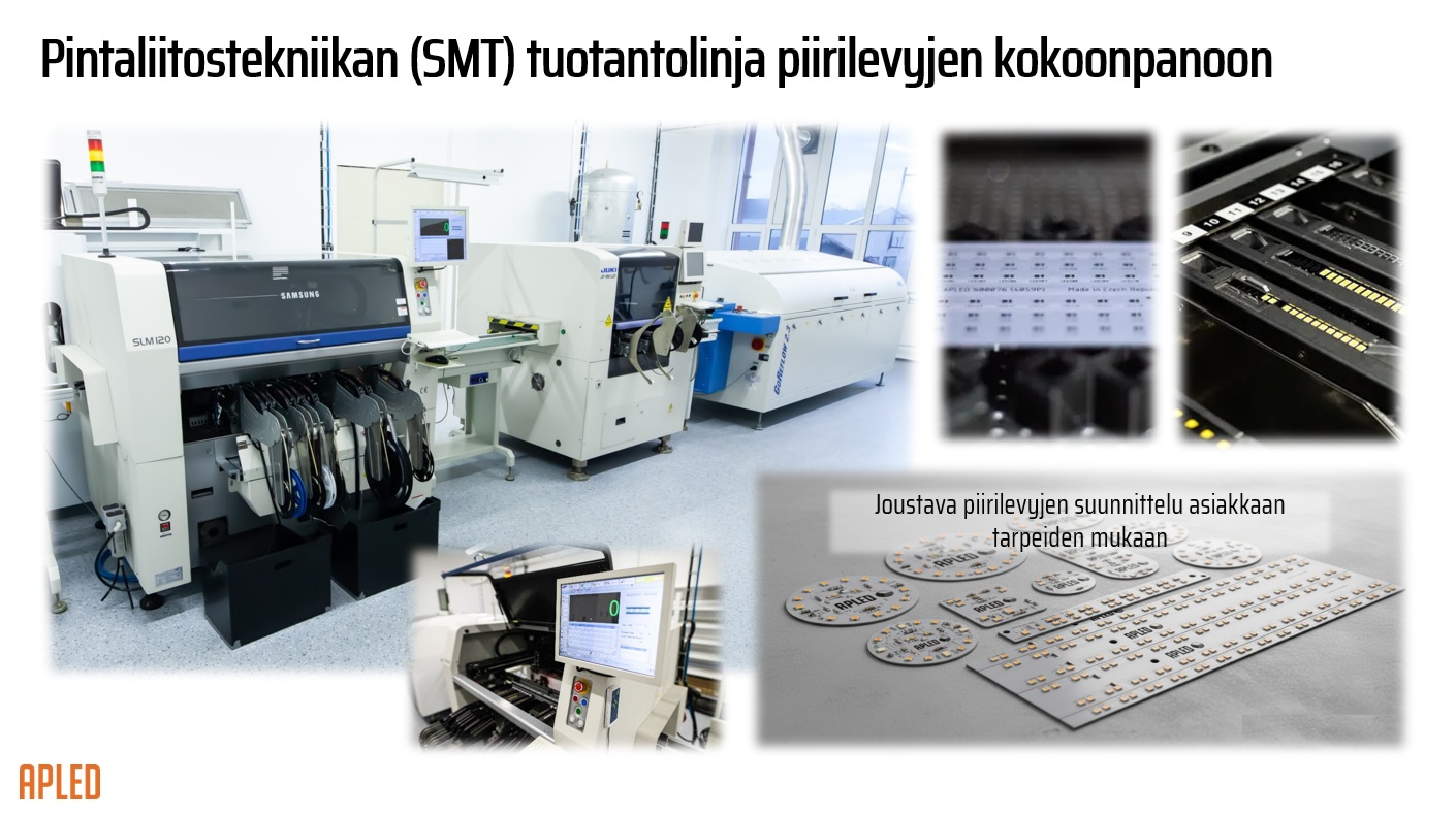 APLEDin tuotevalikoima kattaa laajan kirjon moderneja LED-valaisimia, joissa käytetään uusimman sukupolven LED-diodeja, asennettuna yrityksen itse suunnittelemille moduuleille. Laatu varmistetaan omalla SMT-tuotantolinjalla (Surface Mount Technology) sekä omissa laboratorioissa, joissa jokaisen valaisimen ominaisuudet ja käyttöikä testataan huolellisesti.