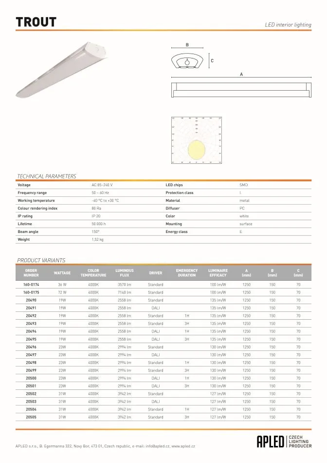 TROUT serijos paviršiniai LED šviestuvai sujungia didelį šviesos srautą, patvarų korpusą ir įvairius techninius sprendimus – puikiai tinka šiuolaikinėms vidaus patalpoms, kur įleidžiamas montavimas nėra galimas arba pageidaujamas. Šviestuvo matmenys yra 1250 × 150 mm, o IP20 apsaugos klasė užtikrina tinkamumą sausoms patalpoms.