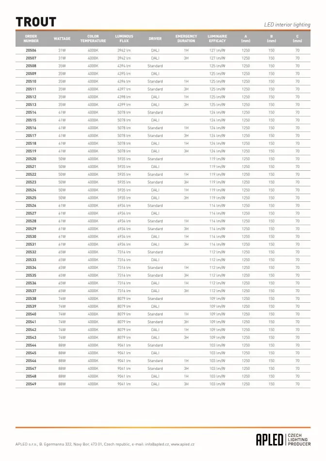 Visi TROUT šviestuvai gaminami Europos Sąjungoje, APLED gamintojo, užtikrinant aukštą kokybę, patikimumą ir atitiktį ES standartams.