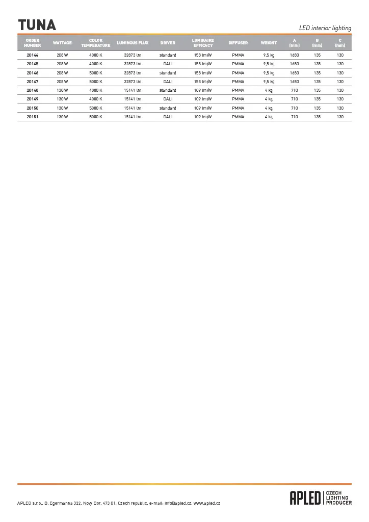 TUNA LED pramoniniai šviestuvai skirti naudoti pramoninėje, sandėliavimo ir gamybinėje aplinkoje, kur svarbus patikimumas, šviesos efektyvumas ir ilgaamžiškumas. Šviestuvai turi aliuminio korpusą, kuris užtikrina gerą šilumos išsklaidymą ir ilgą tarnavimo laiką net ir sudėtingomis sąlygomis.
