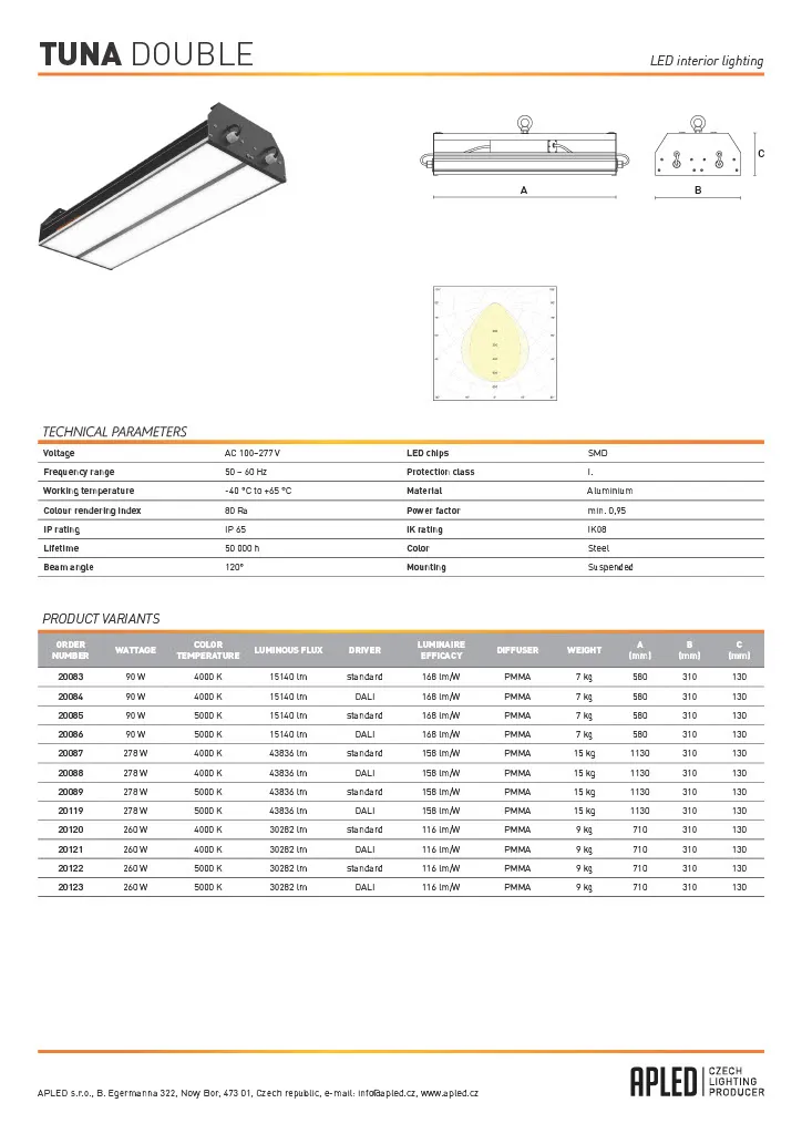 TUNA DOUBLE serijos šviestuvai sukurti reikliai pramoninei, sandėliavimo ir gamybos aplinkai, kur ypač svarbus didelis šviesos našumas, patikimumas ir patvarumas. Palyginti su įprasta TUNA serija, DOUBLE linija siūlo didesnį galingumą ir šviesos srautą, todėl puikiai tinka aukštoms patalpoms ir zonoms, kur reikalingas intensyvus apšvietimas.